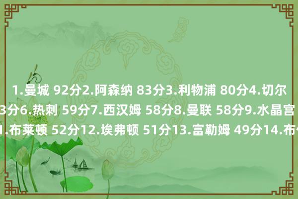1.曼城 92分2.阿森纳 83分3.利物浦 80分4.切尔西 76分5.纽卡斯尔 73分6.热刺 59分7.西汉姆 58分8.曼联 58分9.水晶宫 56分10.维拉 56分11.布莱顿 52分12.埃弗顿 51分13.富勒姆 49分14.布伦特福德 44分15.伯恩茅斯 41分16.狼队 36分17.莱斯特城 35分18.诺丁汉丛林 21分19.南安普顿 21分20.伊普斯维奇 14分